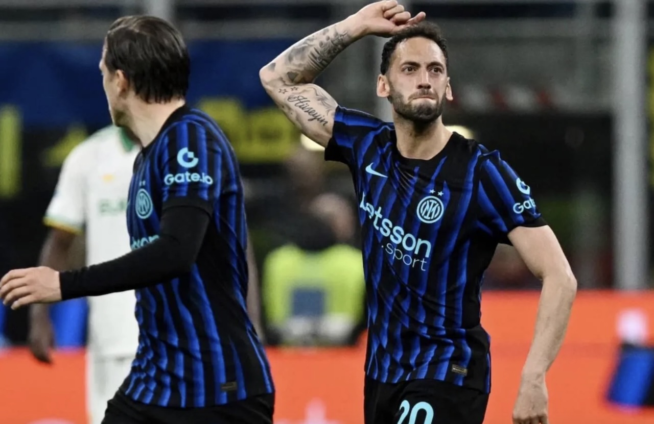Rating pemain Inter Milan yang menghajar AS Roma 5-2. Foto: Hakan Calhanoglou merayakan gol ke gawang Roma di San Siro, 6 April 2026. -marco luzzani -AFP via Getty Images