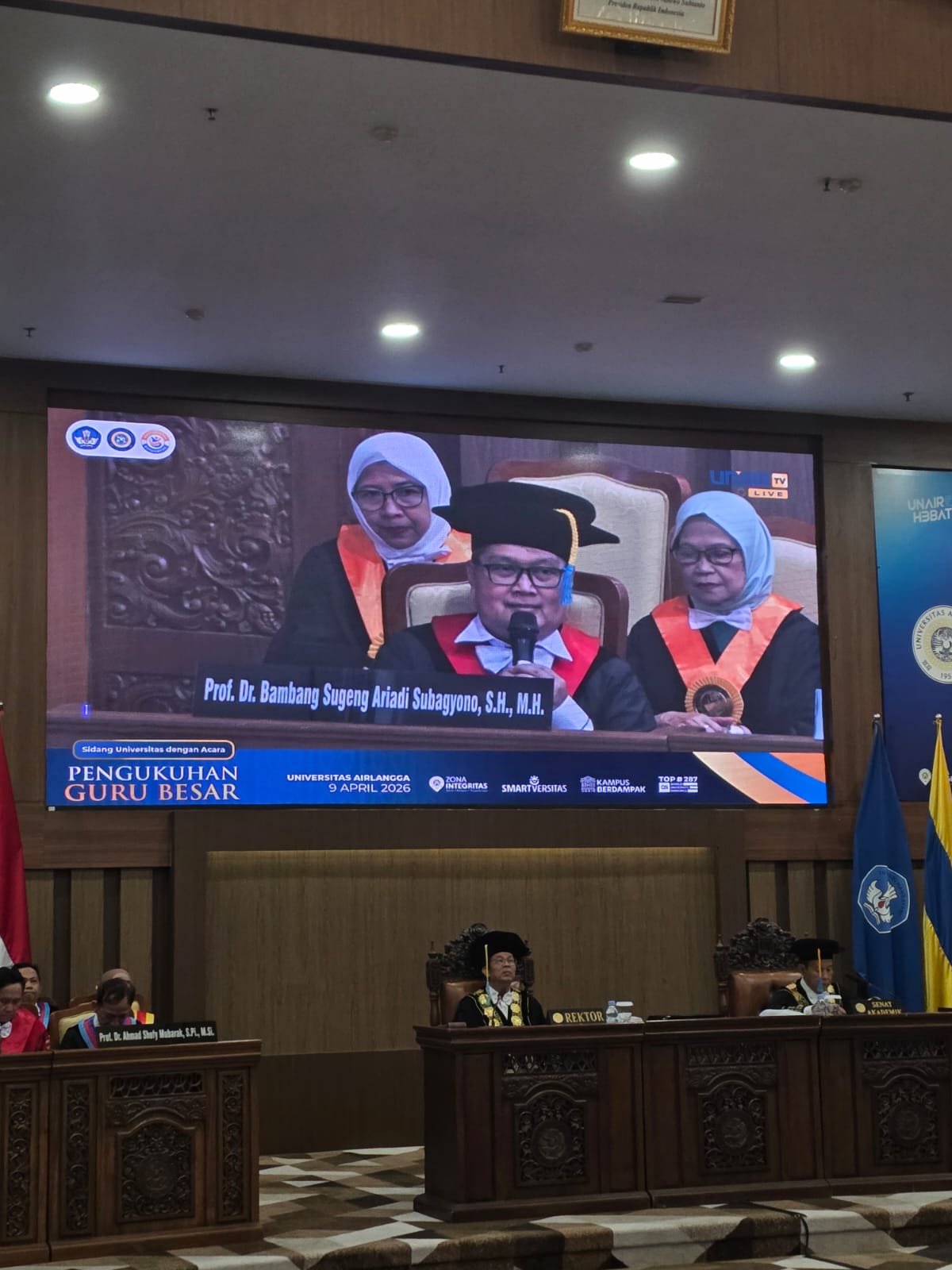 Guru Besar Unair Prof. Dr. Bambang Sugeng Ariadi Subagyono menyampaikan orasi ilmiahnya, Kamis, 9 April 2026, di Aula Garuda Mukti, Gedung Kantor Manajemen Kampus MERR-C UNAIR.-IST-IST