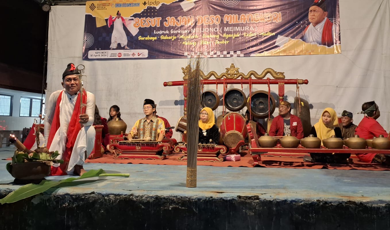 Itulah yang tampak dari pementasan Besut Jajah Deso Milangkori. Digelar oleh seniman Meimura di pelataran gedung Dewan Kesenian Sidoarjo, 10 April 2026.