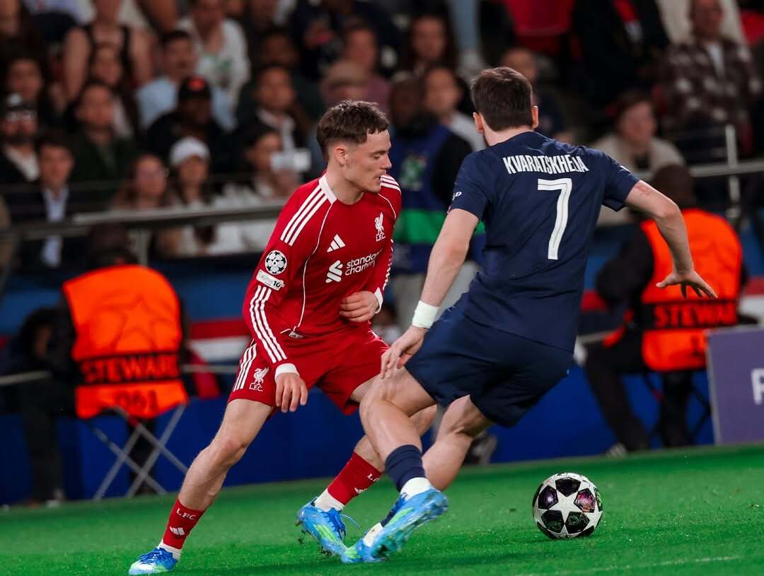 Aksi penyerang Liverpool, Florian Wirtz (kiri), ketika berusaha melewati kawalan penyerang PSG, Khvicha Kvaratskhelia (kanan). Kamis, 9 April 2026.--Instagram @liverpoolfc