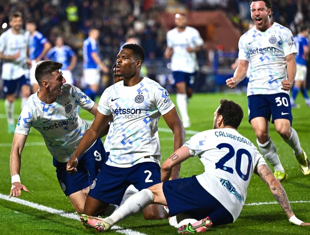 Como vs Inter 3-4, Nerazzuri curi 3 poin penting di kandang lawan. Foto: para pemain Inter merayakan gol Denzel Dumfries pada Senin, 13 April 2025.-Giuseppe Bellini -AFP via Getty Images