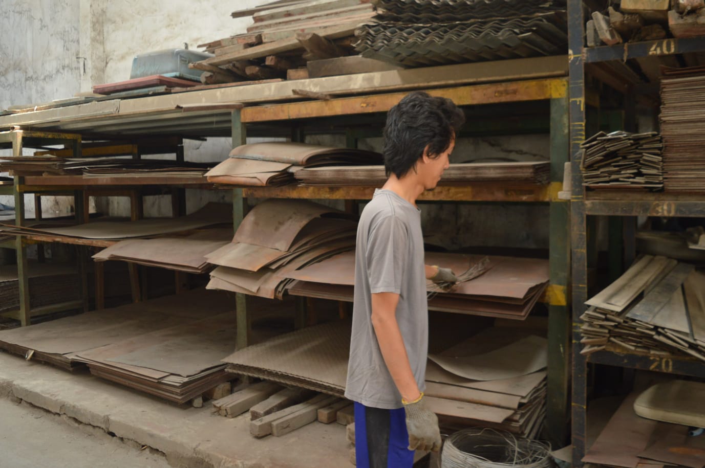 Memasuki area bengkel yang luas itu, tampak deretan stok material plat besi tersusun rapi. Berjajar hingga ujung ruangan. Di ujung tersebut, terdapat sebuah rumah yang menyatu dengan area kerja.