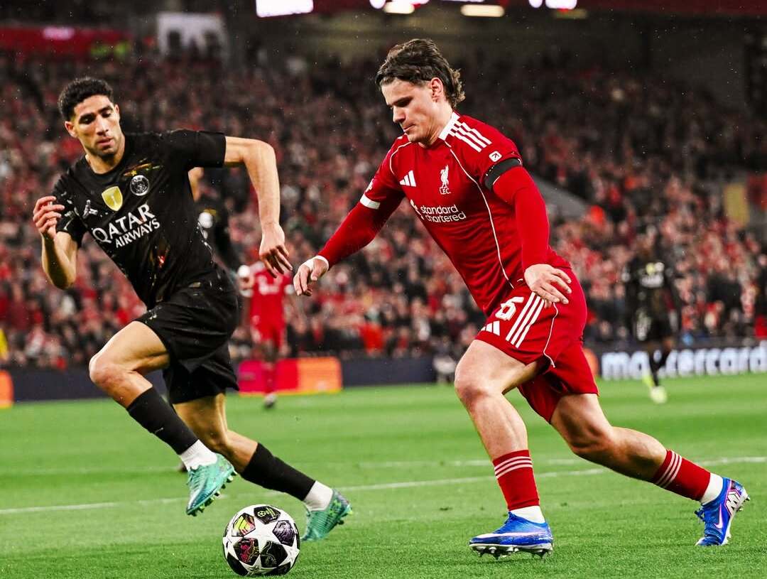 Aksi bek PSG, Achraf Hakimi (kiri), ketika mengawal pergerakan bek Liverpool, Milos Kerkez (kanan). Rabu, 15 April 2026.--Instagram @liverpoolfc