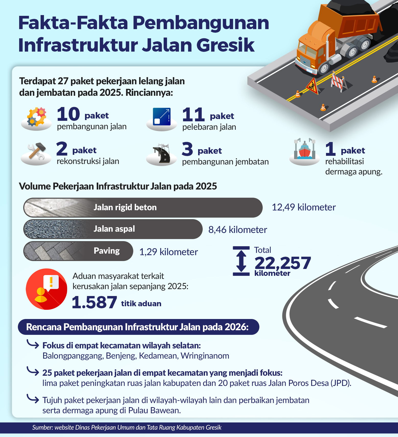 Berdasar kondisi terkini di Kabupaten Gresik, kebutuhan pembangunan maupun peningkatan struktur jalan di wilayah pelosok desa masih cukup tinggi (lihat grafis). Sekitar 70 persen anggaran dinilai perlu diarahkan untuk pembangunan dan peningkatan, sementara 30 persen untuk program pemeliharaan. Skema itu diharapkan mampu mempercepat pemerataan kualitas infrastruktur jalan.
