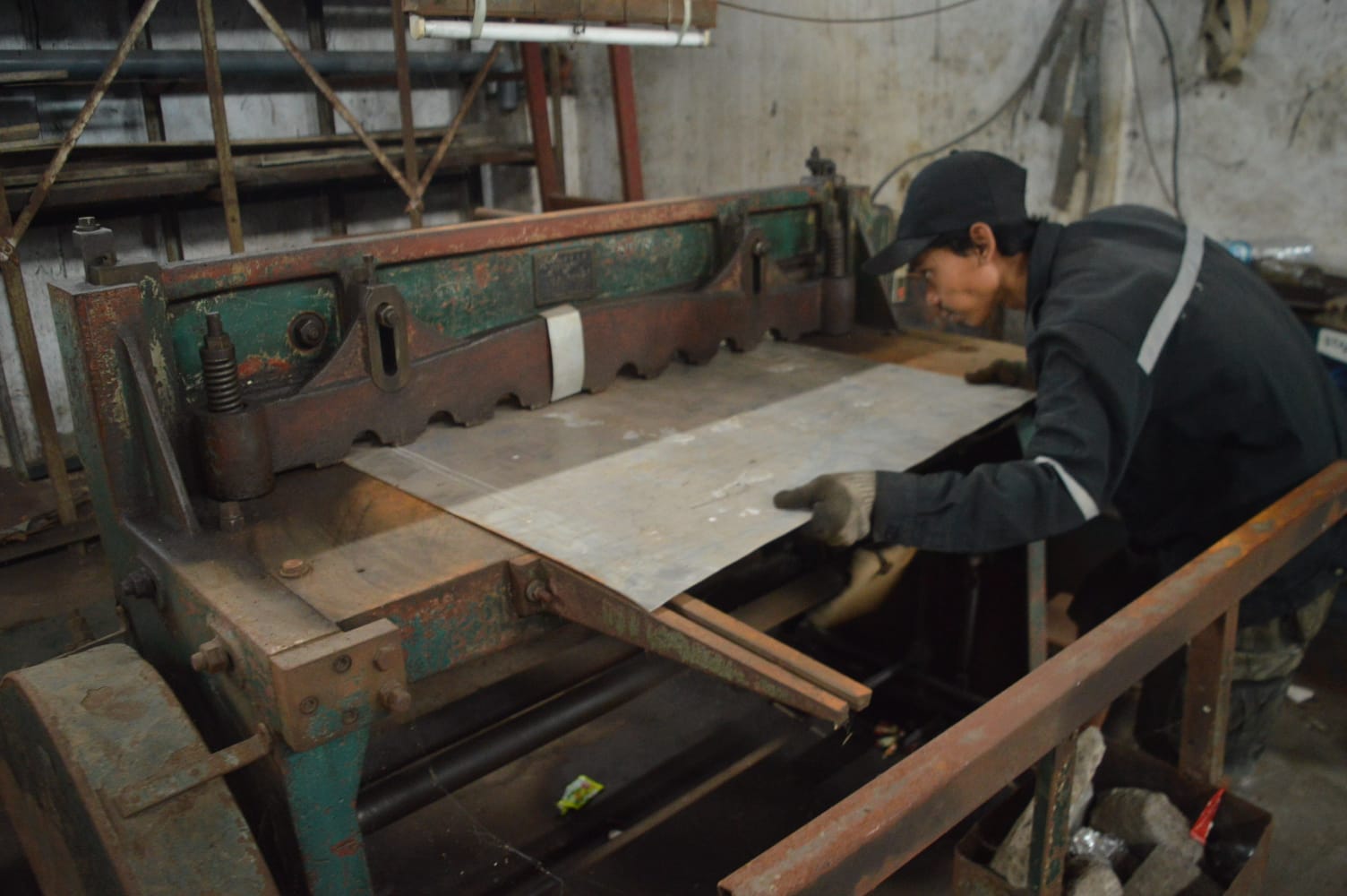Proses pemotongan plat baja di salah satu rumah produksi di Kampung Logam Ngingas, Sidoarjo.-Raden Khansa Pandya Amorta-Harian Disway