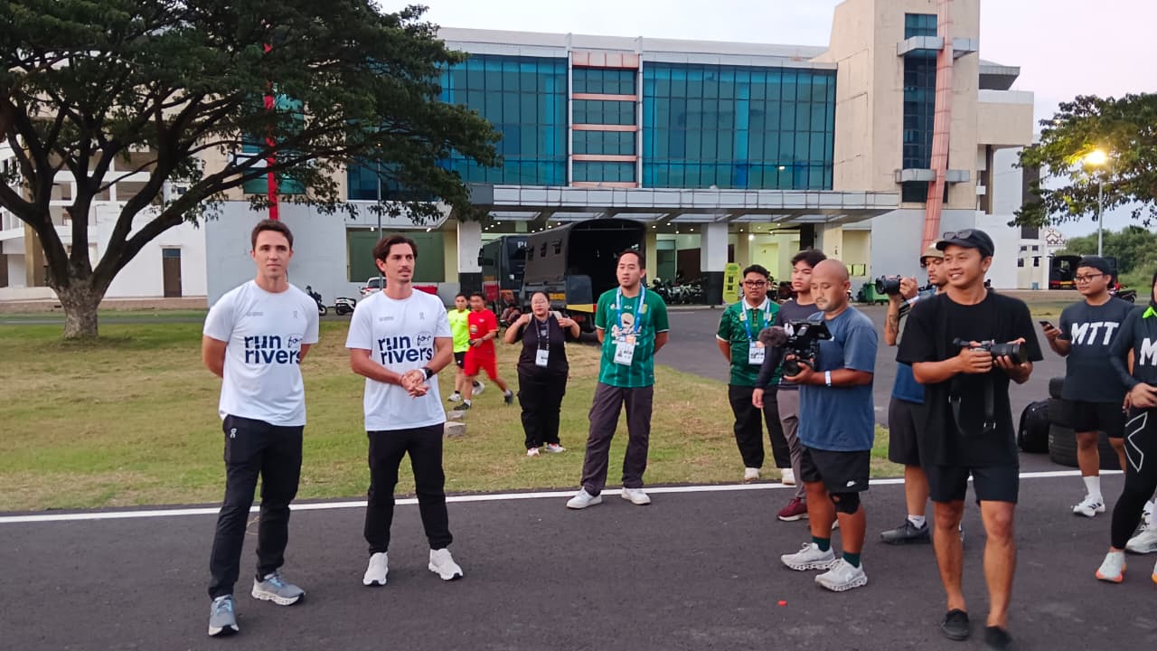 Gary Bencheghib (kiri) dan Sam Bencheghib (kanan) menjelaskan kepada pelari soal kampanye Sungai Watch di fun run pre event Green Force Run, Jumat, 17 April 2026.-Agustinus Fransisco-Harian Disway