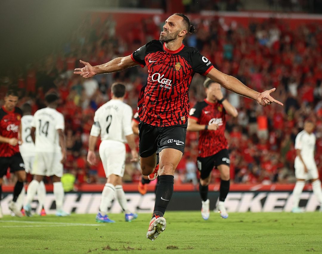 Real Madrid harus puas ditahan imbang Mallorca pada pekan awal La Liga. Foto: Vedat Muriqi meluapkan kegembiraan setelah sundulannya berhasil mengoyak gawang Real Madrid--Instagram @rcdmallorcaofficial