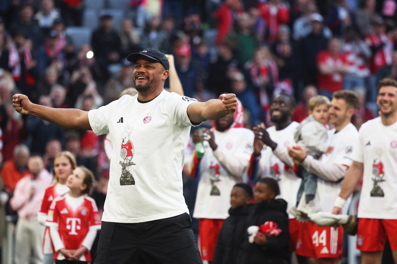 Bayern vs VfB Stuttgart 4-2, Die Roten kunci gelar Bundesliga 2026. Foto: Vincent Kompany merayakan keberhasilan Bayern di Allianz Arena, 19 April 2026.-Karl-Josef Hildenbrand-AFP