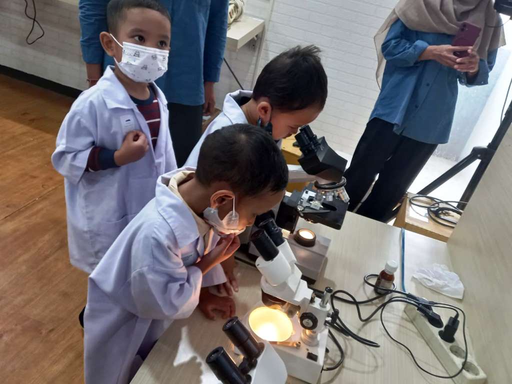 Sekelompok bocah berusia 4-6 tahun belajar menjadi dokter hewan cilik di Bionas Lab pada Minggu, 19 April 2026. Mengamati parasit dengan bantuan mikroskop, serta memberi makan dan memandikan hewan peliharaan.