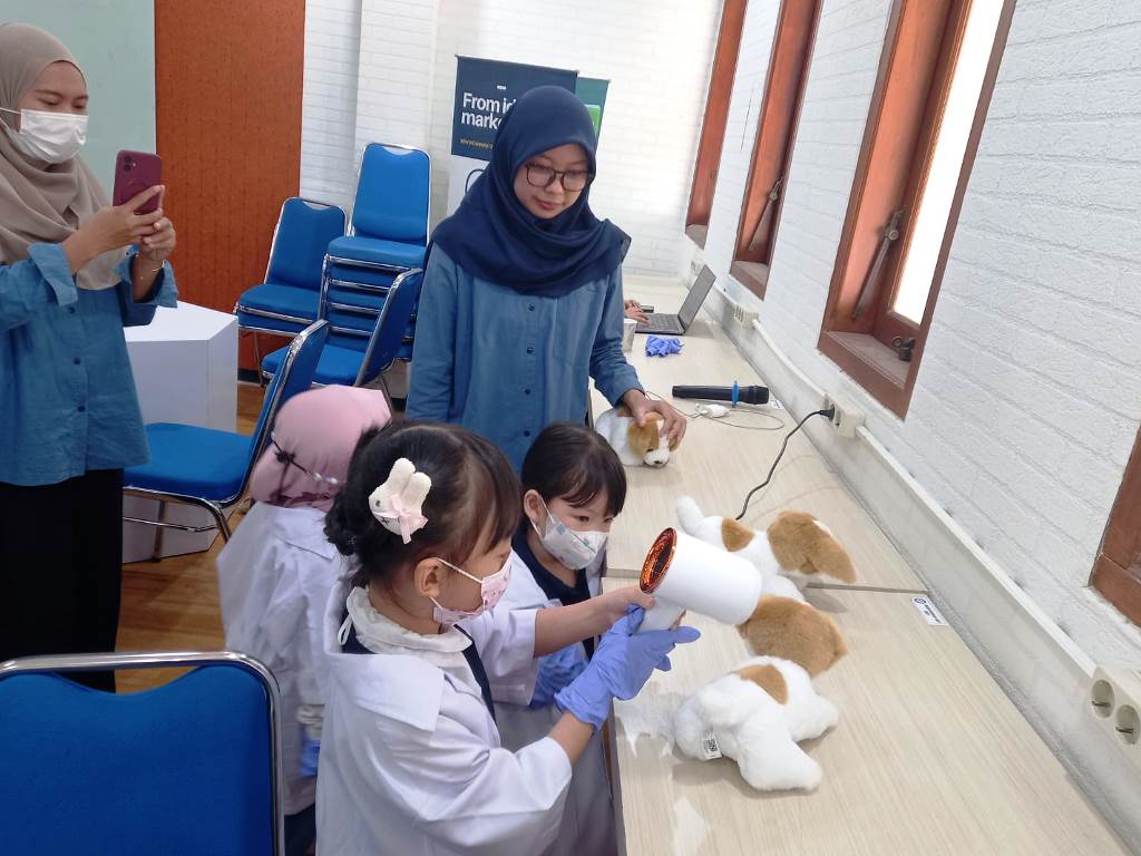 Selain memeriksa pasien hewan, para dokter hewan juga bekerja di laboratorium. Hal tersebut disampaikan Rury kepada anak-anak. "Ada yang tahu tidak, apa yang dilakukan dokter hewan di laboratorium? Bikin obat? Pintar! Apalagi? Eksperimen, betul," pujinya.