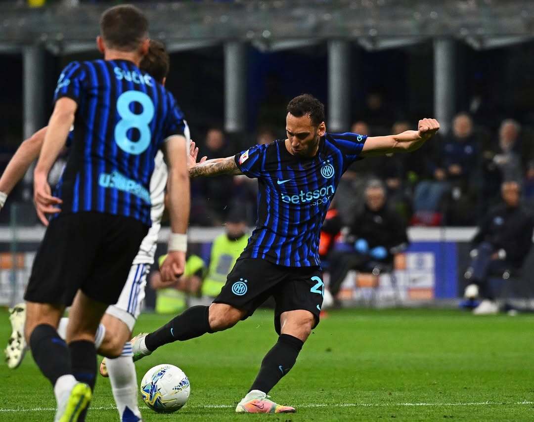 Momen gelandang Inter Milan, Hakan Calhanoglu, ketika mencetak gol penyama kedudukan dalam laga kontra Como. Rabu, 22 April 2026.--Instagram @inter
