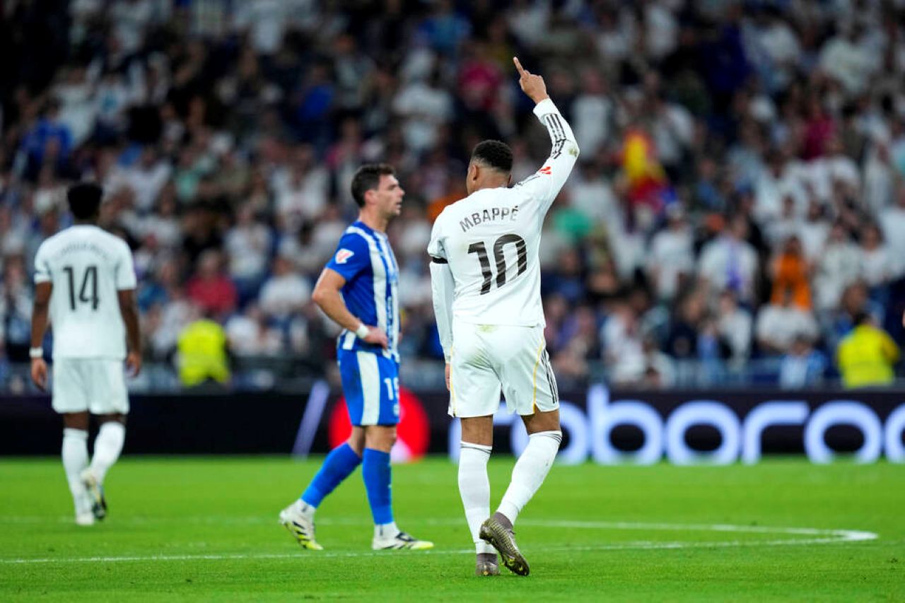 Selebrasi Kylian Mbappe usai buka keunggulan Real Madrid atas Alaves dalam laga La Liga 2025/2026 jornada ke-33, Rabu 22 April 2026--IMAGO