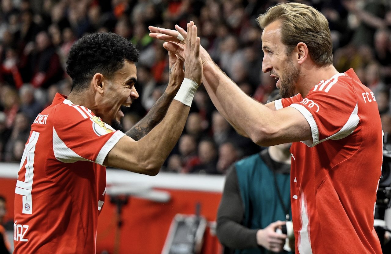 Leverkusen vs Bayern 0-2, Die Roten melaju ke final DFB Pokal. Foto: Harry Kane merayakan kemenangan dengan Luis Diaz di BayArena, 23 April 2026.-AFP-