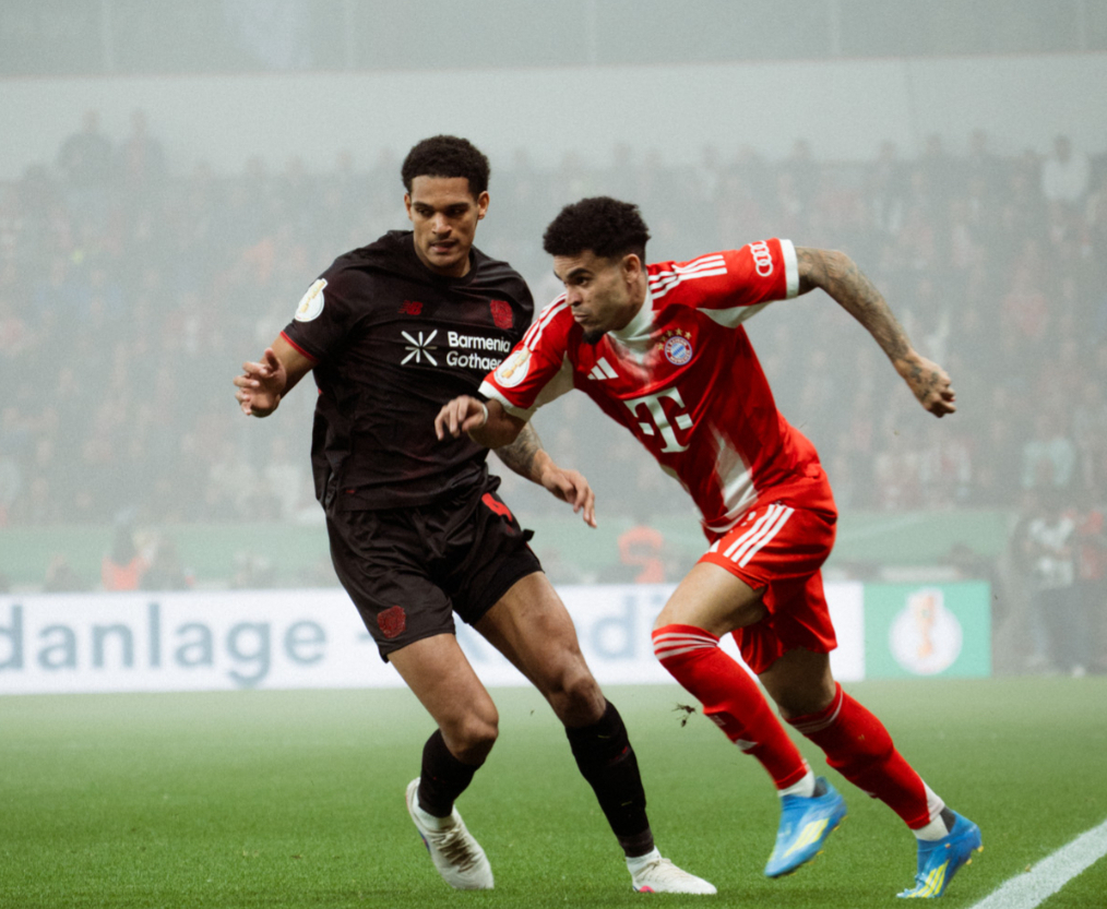 Aksi penyerang Bayern Munich, Luis Diaz (kanan), ketika berebut bola dengan bek Bayer Leverkusen, Jarrell Quansah (kiri). Kamis, 23 April 2026.--Instagram @dfb_pokal