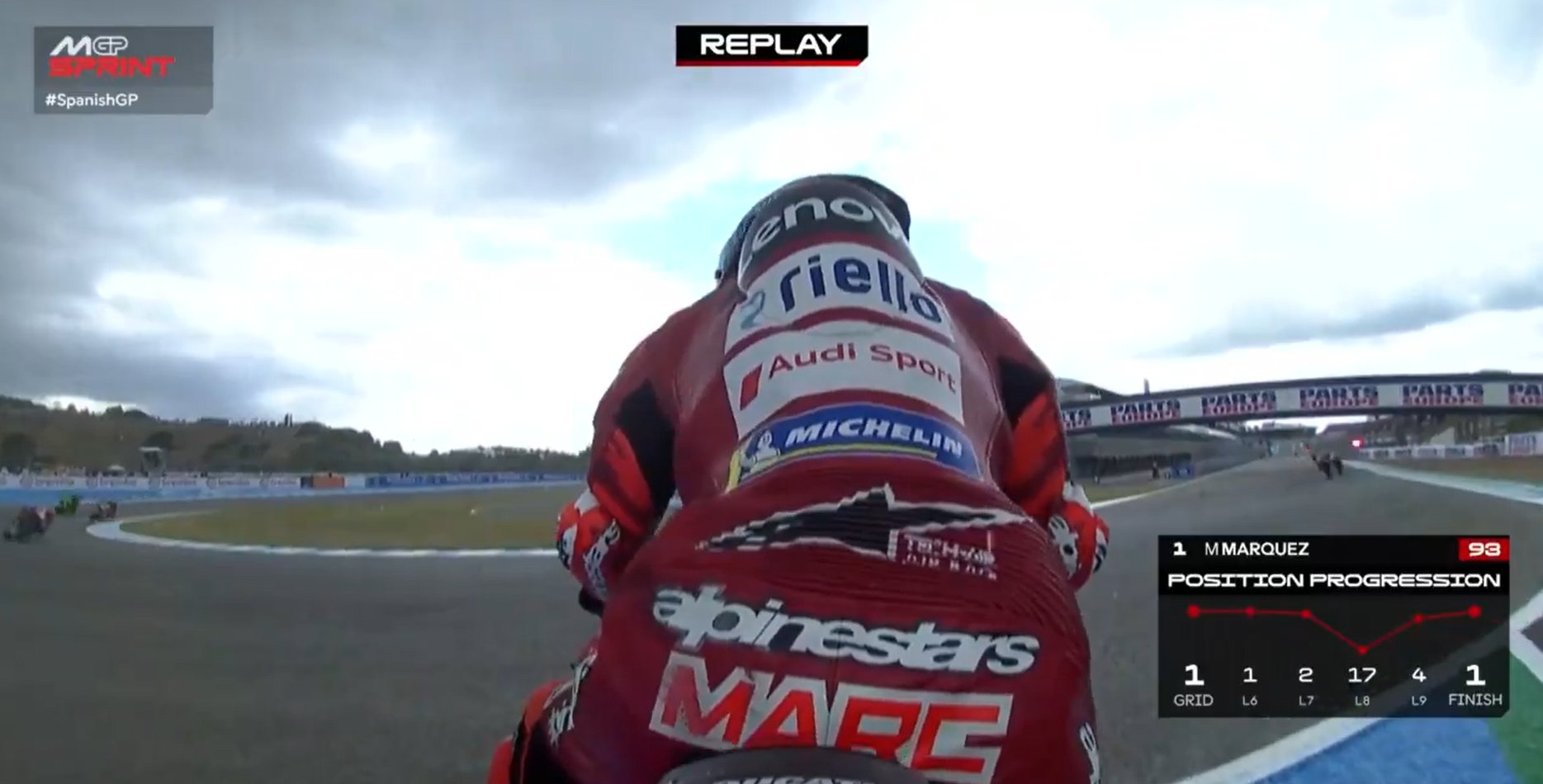 Di Lap 11, Marc yang tampil dominan di kondisi basah berhasil menyalip Pecco Bagnaia untuk merebut kembali posisi pertama. Dan di lap 12 Marc melaju tanpa tekanan hingga garis finis.